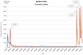 Here is a graph showing the number of daily "first" installations and updates over the past year (click on the image for a larger version):